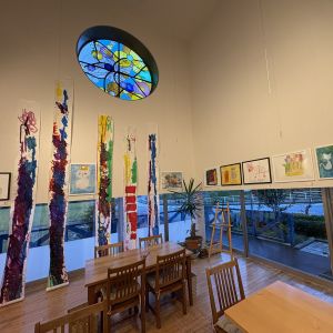 利用者さん一人ひとりの感性や、日々の想いが形となった絵画、織り、立体などの作品の数々が、カフェの空間を温かい「色」で満たしてくれました。
