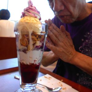 食後にはデザートのチョコレートワッフルやぶどうパフェも注文し、笑顔で口に運ぶ姿が印象的でした。