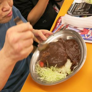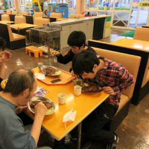 カツカレーやラーメンを選び、スプーンを使って落ち着いた様子で食事を進めていました。