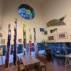 カフェの落ち着いた空間の中で、作品とゆっくり向き合いながら、