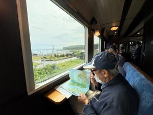 震災語り部観光列車に乗車し、被災した能登の景色を眺めながら